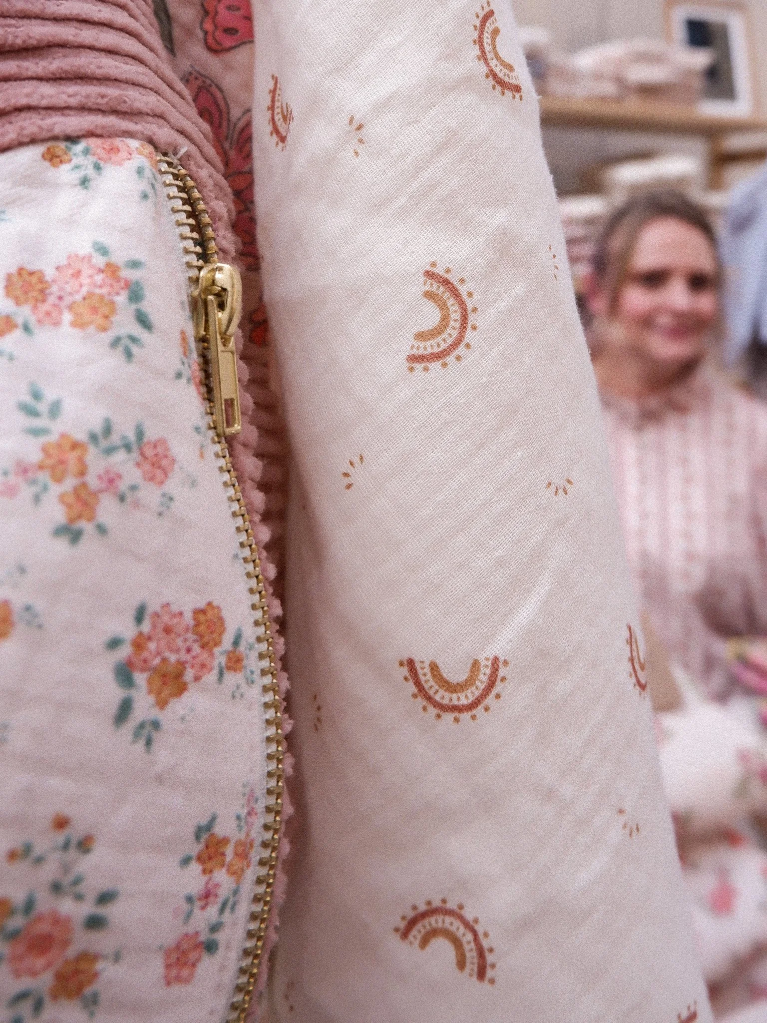 La première étape est toujours de réfléchir à l'organisation de mon stand (2 × 2 mètres, c'est assez petit !). Je voulais présenter ma marque Joli·e Boho, nos tissus exclusifs et quelques sélections, notre patron Romy kids/adultes, nos boutons et les étiquettes Joli·e Boho. Cette année, j'ai modifié l'organisation pour pouvoir installer le portant derrière moi et cacher quelques éléments disgracieux (le fameux compteur électrique) dans mon dos !