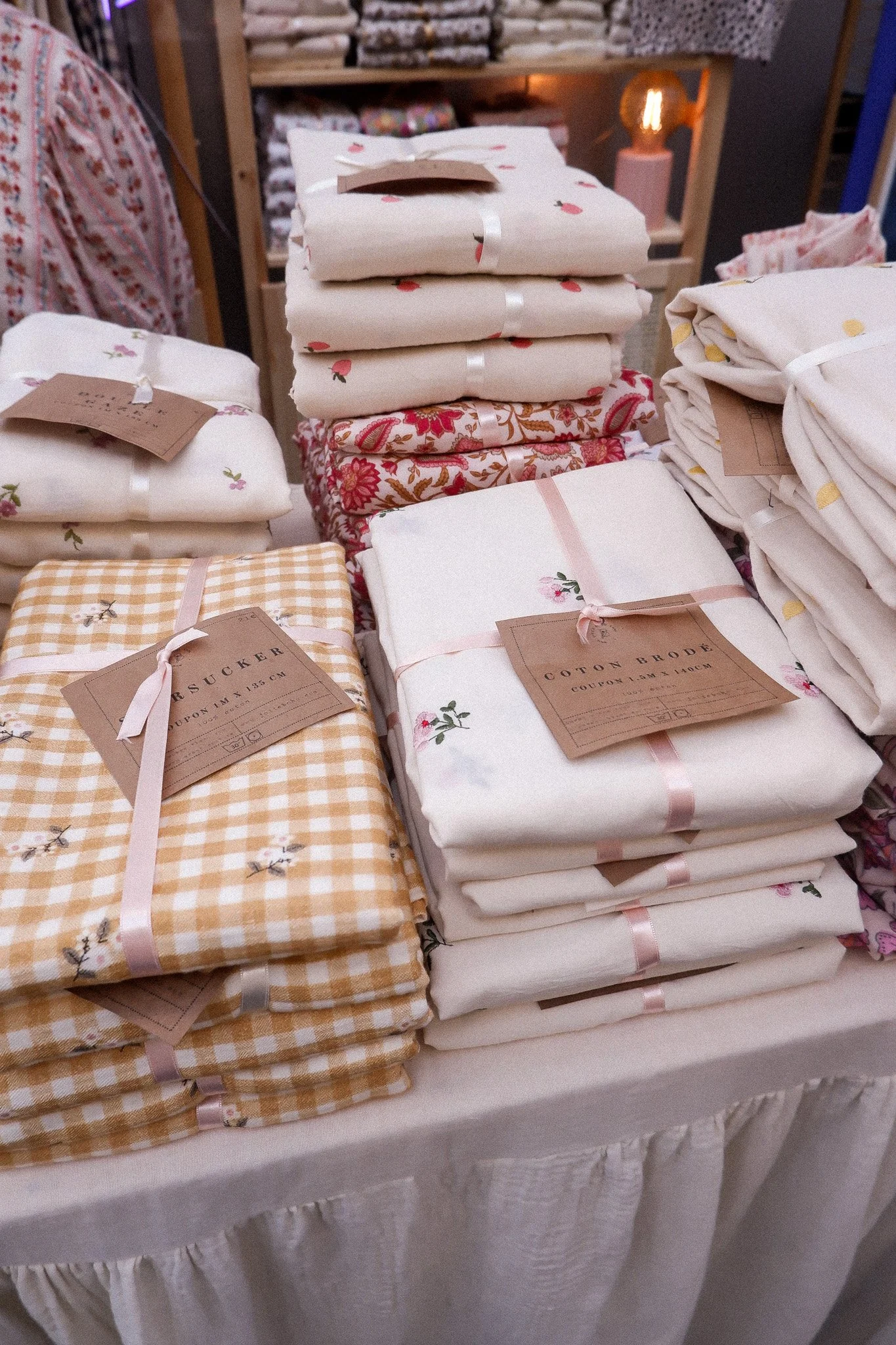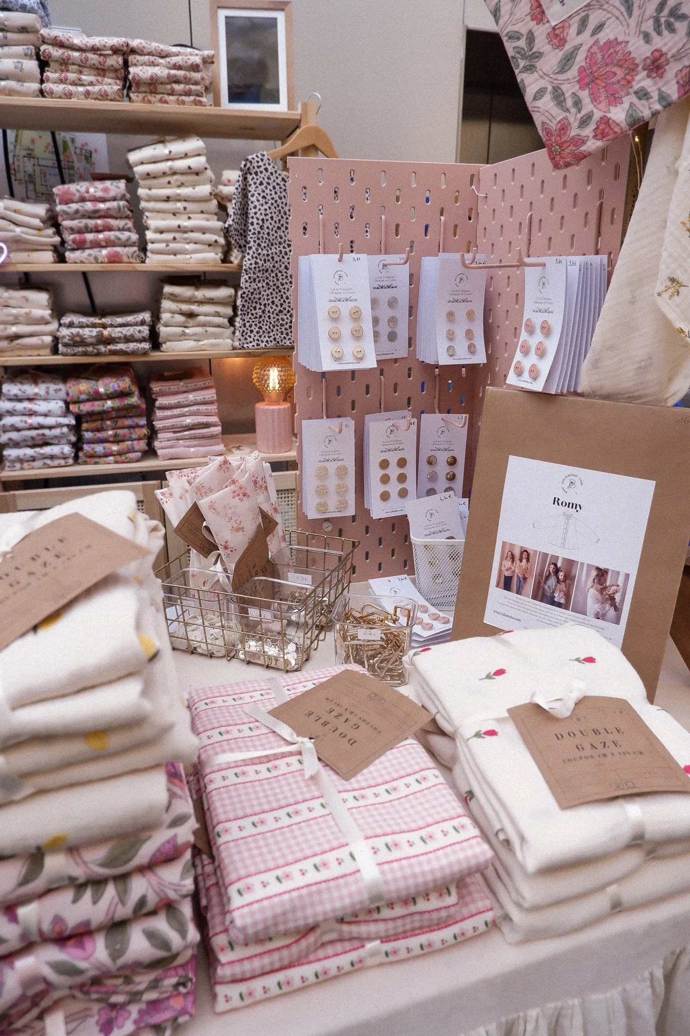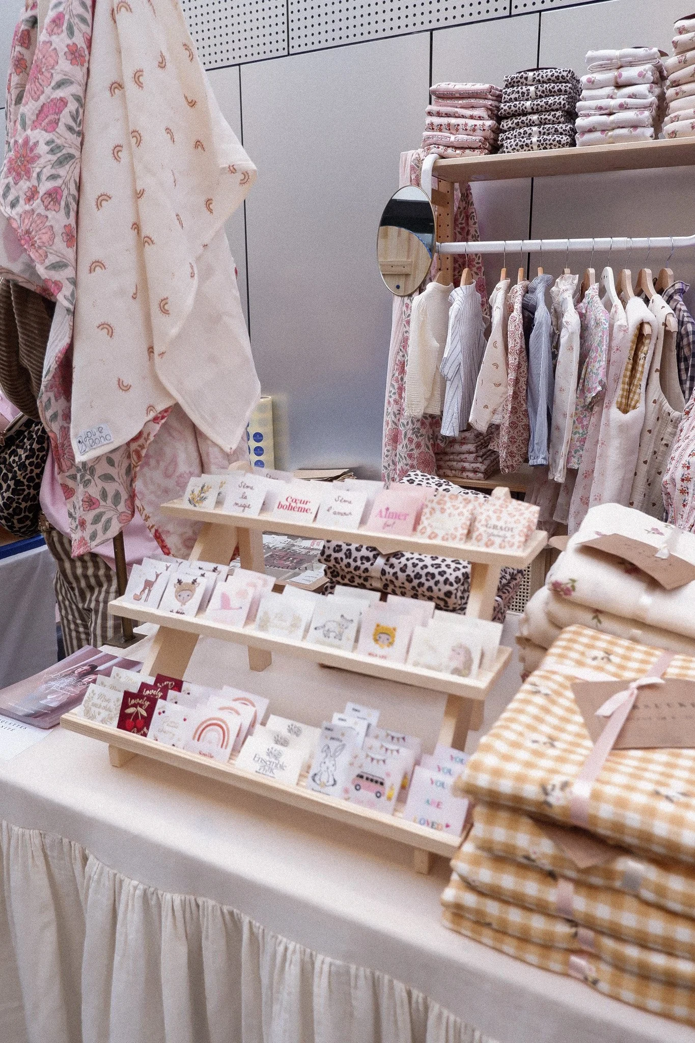 J'avais envie d'aménager le stand pour refléter l'univers bohème et artisanal de nos créations, avec une décoration mettant en valeur les vêtements cousus avec amour, la couture, les tissus, le bois, les dentelles et des tons chauds et lumineux.