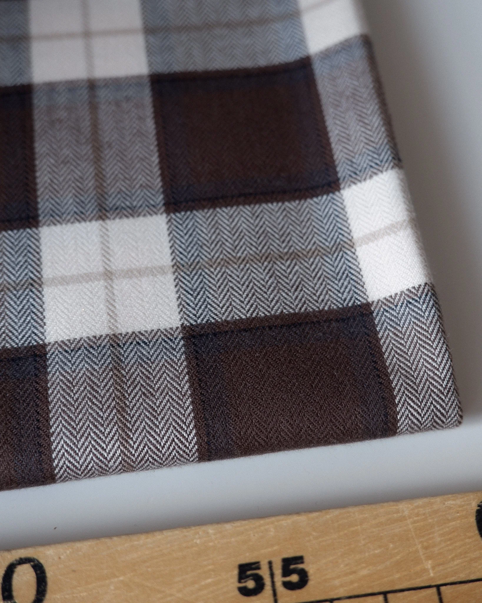 Nollo, c’est le compagnon fidèle des terres sauvages. Inspiré des Highlands écossais et des contrées de l’Ouest américain, ce tissu aux carreaux bruns, argile et encre bleutée respire la liberté.